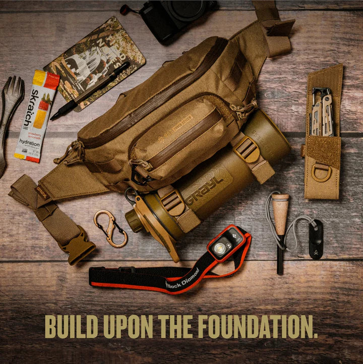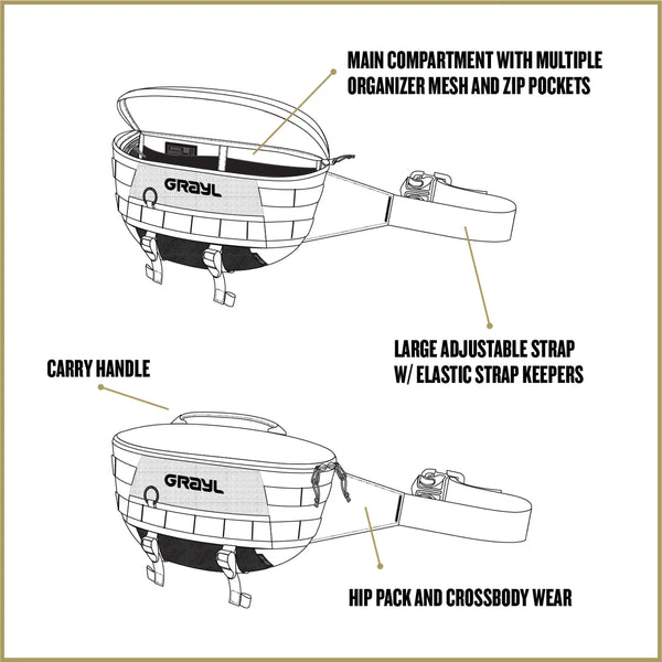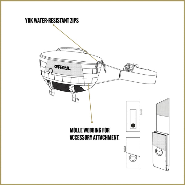 • G-Mod Pod Pouch Friendly. Front Grayl-branded velcro loop panel, molle panels, and metal o-ring for grab-and-go expansion.