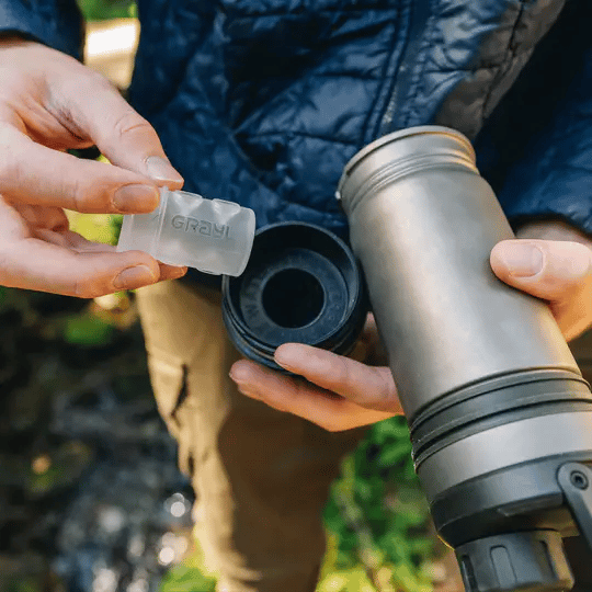 Unequalled versatility. That's Grayl Ti. Filter and purify by the water’s edge and bring it back to camp to boil alongside hot coals, or place it direct on a backpacking stove. It's the world's first titanium water filter bottle and also the first to be compatible with electrolyte and drink-mixes.